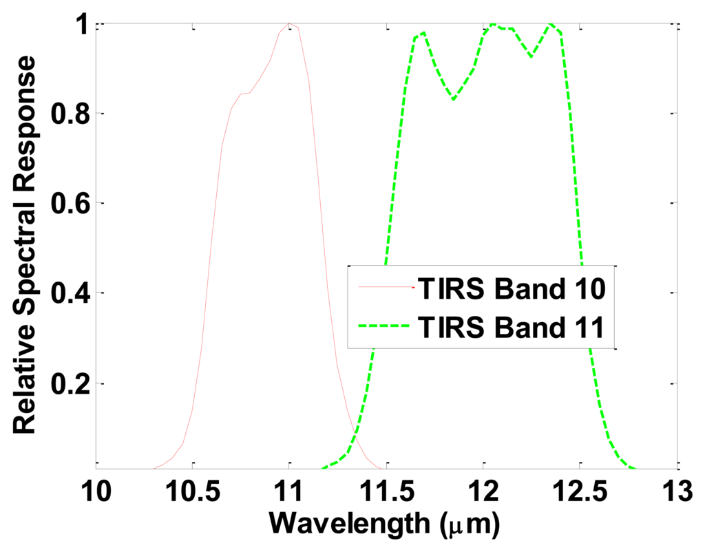 Landsat-8 was successfully launched on 11 February 2013 and deployed into orbit with two instruments on-board: (1) the Operational Land Imager (OLI) with nine spectral bands in the visual (VIS), near infrared (NIR), and the shortwave infrared (SWIR) spectral regions; and (2) the Thermal Infrared Sensor (TIRS) with two spectral bands in the LWIR. The relative spectral response of the TIRS bands is presented in Figure 1. The two TIRS bands were selected to enable the atmospheric correction of the thermal data using a split window algorithm (SWA) [9,10]. The use of two separate, relatively narrow, thermal bands has been shown to minimize the error in the retrieval of LST [11]. The spatial resolution of TIRS data is 100 m with a revisit time of 16 days, and as a result, applications are different than those of other sensors with coarser spatial resolutions and shorter revisit times. While Landsat-8 images are already freely distributed through the U.S. Geological Survey (USGS), to the best of our knowledge, no SWA for LST retrieval from TIRS has been published. Although several SWAs have been developed for use with other sensors [12–15], some adaptations are required in order to implement them for the TIRS spectral bands. Therefore, the objective of this letter is to develop a SWA, adapted for use with Landsat-8 TIRS data, along with its accuracy assessment.