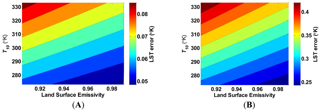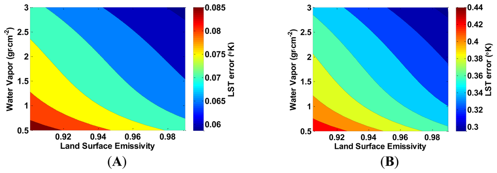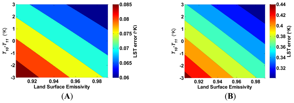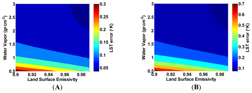 The LST estimation error increases when the atmospheric water vapor content decreases (and, thus, the atmospheric transmittance increases). This effect increases rapidly as the brightness temperature difference between TIRS bands 10 and 11 increases, as seen in Figure 3B,C. However, the contribution of the water vapor estimation error to the LST estimation is complex and also depends on the emissivity in both channels, as seen in Figure 4.