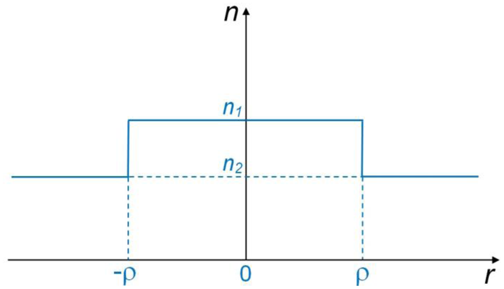 The basic model for microfiber optics is illustrated in Figure 1, in which the refractive indices of the microfiber and the surrounding are assumed to be n1 and n2, respectively. With the microfiber radius of ρ, the step-index profile of a waveguiding microfiber is then expressed as: