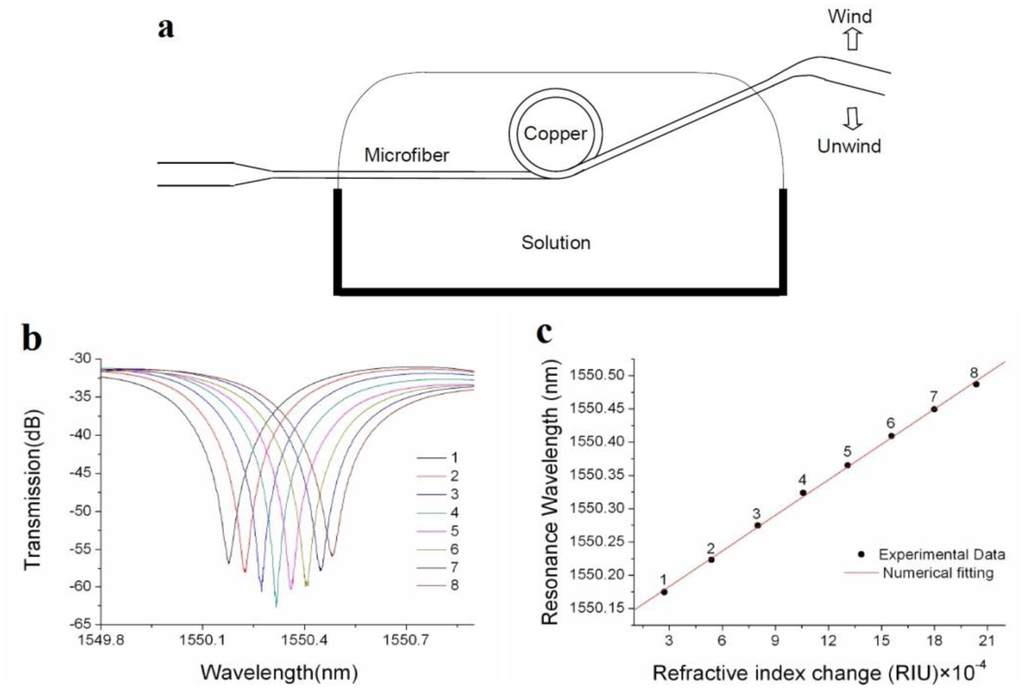 Although the free-standing microfiber loop is easy to fabricate, since the loop structure is maintained by van der Vaals or electrostatic forces at the joint area, it is mechanically fragile, especially in liquid environment. To enhance the robustness of a microfiber loop for operating in liquid environment, in 2007 Guo et al. reported an copper-rod-supported loop resonator assembled by wrapping a 2.8 μm diameter microfiber around a 460 μm diameter copper rod [50], with a maximum extinction of 30 dB and a Q of about 4000 around 1.53 μm wavelength. With the copper-rod supporting, the microfiber loop exhibits high stability and flexibility of achieving critical coupling within a broad spectral range [51], enabling high-sensitivity optical sensing in both low- and high-concentration solutions (Figure 11), with estimated sensitivity of refractive-index measurement up to 1.8 × 10−5.
