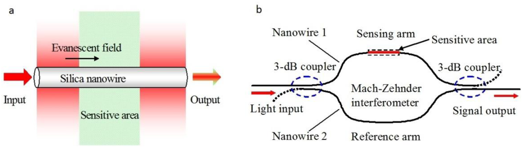Optical interferometers are among the most powerful structures for optical sensing. As a miniaturized optical interferometer, the microfiber MZI is of particular interest for phase-sensitive optical measurement with compact size and high sensitivity. In 2005, based numerical calculation, Lou et al. modeled a microfiber-MZI optical sensor (Figure 13) for refractive index measurement in liquid environment, and predicted a sensitivity one order of magnitude higher than those of conventional waveguide MZIs [12].