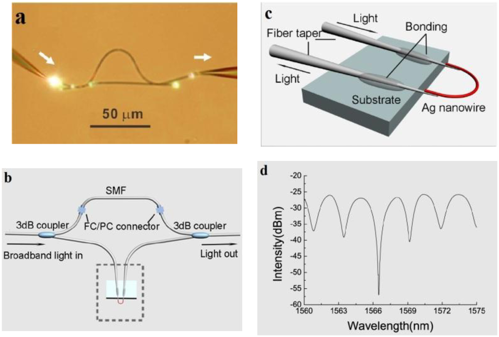 In 2008, Li et al. experimentally demonstrated microfiber MZIs assembled from silica and tellurite glass microfibers, with microfiber diameter down to 480 nm and footprints down to 50 μm (Figure 14a) [79]. In 2012, Wo et al. reported a simple and robust refractive index sensor based on a microfiber MZI, as shown in Figure 15 [80]. Using a 2 μm diameter microfiber as the sensing arm, the sensor realized a RI sensitivity of 7159 μm/RIU. Jasim et al. reported a microfiber-MZI-based current sensor, with a slope efficiency of 60.17 pm/A2 [81]. Very recently, by integrating a Ag nanowire with a microfiber MZI (Figure 14b–d), Li et al. demonstrated a hybrid photon-plasmon MZI for fiber-compatible plasmonic sensing, with a response time of 0.3 s and a sensitivity better than 100 ppm for NH3 gas sensing [82].