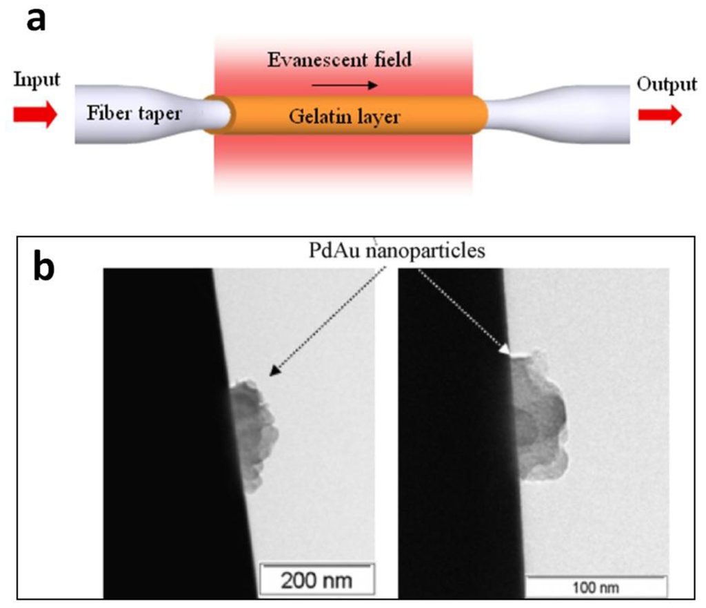 Typically, glass or polymer microfibers directly drawn from undoped materials are passive structures. Functional activation is desired for many sensing applications. For glass microfibers, one of the most convenient approaches is coating the microfiber with a functional film while maintaining its waveguiding capability. In 2005, based on a 1.3 μm diameter silica microfiber coated with an ultra-thin palladium film, Villatoro et al. reported a miniature hydrogen sensor operated at 1550 nm wavelength [83]. Relying on the hydrogen-concentration-dependent transmission intensity of the microfiber, they successfully demonstrated a fast-response (∼10 s) hydrogen sensor with low detection limit. In 2008, by coating a 80 nm thickness gelatin layer on the sidewall of a 680 nm diameter biconical microfiber (Figure 16), Zhang et al. reported a microfiber optical sensor operated at 1550 nm wavelength for fast detection of relative humidity (RH) [84]. When exposed to moisture, the change in refractive index of the gelatin layer changes the mode field of the guided mode, and converts a portion of power from guided mode to radiation mode, resulting in RH-dependent loss for optical sensing. The sensor is operated within a wide humidity range (9%–94% RH) with high sensitivity and good reversibility. Measured response time is about 70 ms, which is one or two orders of magnitude faster than other types of RH sensors relying on conventional optical fibers or films. In 2010, by decorating a 10 μm diameter silica microfiber with PdAu nanoparticles (Figure 17), Monzon-Hernandez et al. demonstrated a microfiber hydrogen sensor [85]. Relying on reversible optical transmission changes originated from hydrogen-concentration-dependent nanoparticle scattering, the sensor was capable of detecting low concentrations of hydrogen (up to 8%) at room temperature with response and recovery times on the order of seconds, which was faster than many other hydrogen sensors that exploit phenomena at the nanoscale. Using similar configurations, more functionally coated or decorated microfiber optical sensors have been reported recently [86,87].