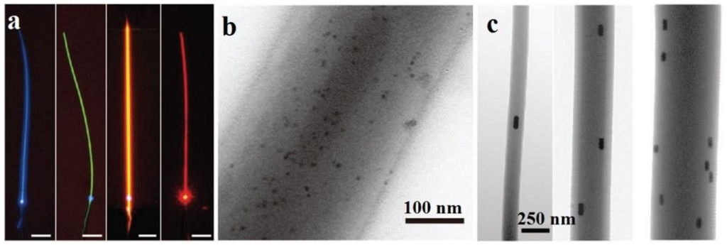 - Li, M.; Zhang, J.; Zhang, H.; Liu, Y.; Wang, C.; Xu, X.; Tang, Y.; Yang, B. Electrospinning: A facile method to disperse fluorescent quantum dots in nanofibers without Förster resonance energy transfer. Adv. Funct. Mater. 2007, 17, 3650–3656. [Google Scholar]