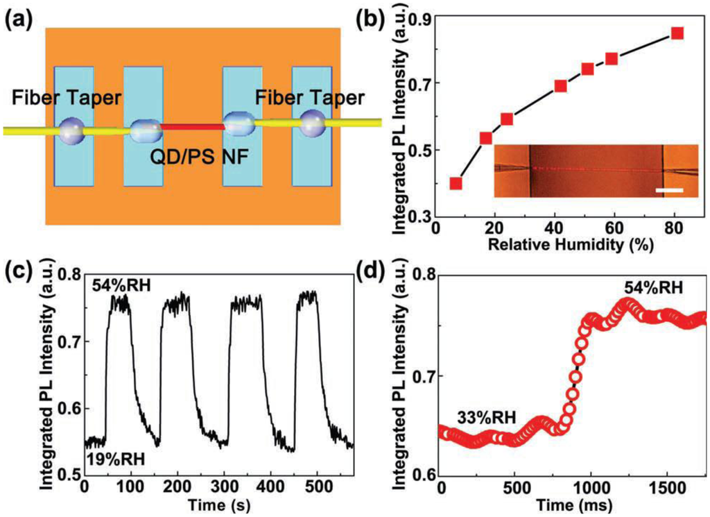 For polymer microfibers, owing to the excellent hospitality for exotic dopants, a number of functional dopants, including dye molecules [88–91], chemical indicators [92], quantum dots [30,93–95] and noble metal nanoparticles [31], have been doped inside waveguiding polymer microfibers for optical sensing (Figure 17). In 2008, based on spectral response of an acidic-to-basic form change of bromothymol blue (BTB) doped in a 270 nm diameter poly(methyl methacrylate) (PMMA) microfiber, Gu et al. demonstrated a microfiber NH3 sensor with a detection limit of 3 ppm and a response time of about 1.8 s, much faster than conventional ammonia sensors [92]. In 2010, to activate the microfiber with high resistance to photobleaching, Meng et al. doped a 480 nm diameter PS microfiber with CdSe/ZnS QDs, and realize a miniaturized optical humidity sensor based on the surface passivation of QD emission (Figure 18) [30]. The sensor offered a response time of 90 ms under a pumping power (532 nm CW light) of merely 0.1 nW, representing an ultra-low power optical nanosensor. More recently, by doping a 540 nm diameter polyacrylamide (PAM) microfiber with gold nanorods (GNRs) whose plasmonic resonance bands were highly dependent on environmental refractive index, Wang et al. demonstrated a low-power fast-response optical humidity sensor that is intrinsically immune to photobleaching [31].