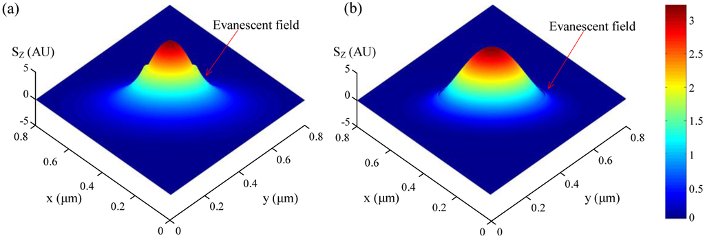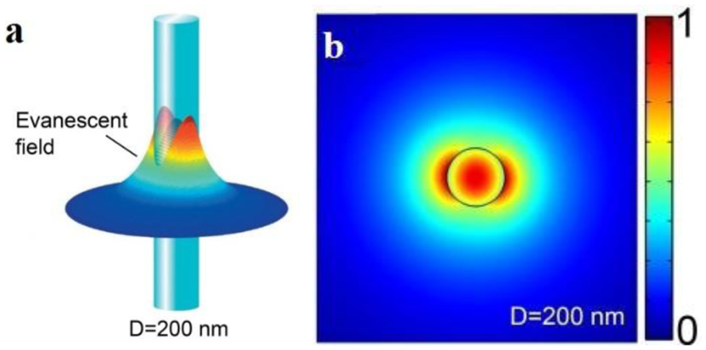 For example, Figure 4 shows the z-components of the Poynting vectors (Sz) of the HE11 mode of a 200 nm diameter silica microfiber guiding a 633 nm light in air, with a fractional power of about 90% guided as evanescent fields outside the microfiber, the guiding mode is confined within a 600 nm area [3]. The tightly confined high fractional evanescent fields is especially desired for ultra-sensitive optical sensing of localized samples in forms of micro or nanoparticles [4,12,17].