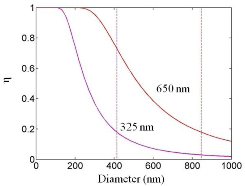 For optical sensing applications the microfiber is usually operated in single mode, and it is important to know the fractional power of optical fields guided outside the microfiber. Using propagation constants obtained by numerically solving Equation (2), the profile of the evanescent fields and the power distribution around the microfiber can be obtained. For example, Figure 2 shows the z-components (the only non-zero component along the axial direction of the microfiber) of the Poynting vectors (Sz) of the HE11 mode of a 200 and 400 nm diameter silica microfiber in water at 325 nm wavelength [12], respectively. The refractive indices of the silica (1.457 at 650 nm wavelength, and 1.482 at 325 nm wavelength) and water (1.333 at 650 nm wavelength, and 1.355 at 325 nm wavelength) are obtained from their dispersion formulas at room temperature [13,14]. The evanescent field (separated from the central peak with a discontinuous gap) outside the guiding microfiber core is clearly seen, which is very sensitive to index change of the surrounding media. Compared with the 400 nm diameter one, the 200 nm diameter microfiber offers much higher fraction of evanescent waves, and thus much more sensitive to the surroundings. Calculated fractional power of the evanescent wave outside the microfiber at 325 and 650 nm wavelengths is also shown in Figure 3 [12]. Depends on the diameter, a single-mode silica microfiber can guide light with about 20 to almost 100 percent of energy as evanescent waves, which has been confirmed by previous reports [9,15,16] and is difficult to achieve in many other optical waveguides with much higher sidewall roughness. The high fractional evanescent fields is very helpful for achieving high sensitivity for index measurement in homogeneously distributed samples [4]. Moreover, benefitted from the large index contrast, a microfiber can offer high fractional evanescent fields with tight spatial confinement.
