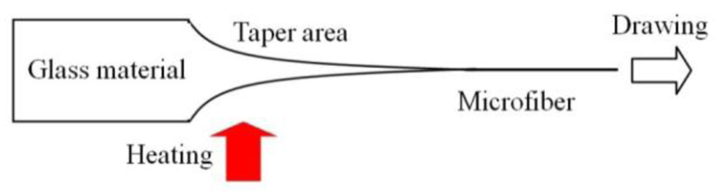 Glass microfibers are usually fabricated by taper drawing of glass fiber or bulk glass at high temperature, as illustrated in Figure 5. The heating source can be a flame (usually a hydrogen flame) [9,15,18–21], an electrical heater [22–24] or a laser-heated tube [25–28]. Depending on the heating conditions and the material properties around the melting temperature, the drawing speed varies from tens of micrometers to several meters per second. By precisely controlling the drawing speed, heating conditions and subsequently the geometric profile of the tapering region, an microfiber drawn from a standard glass fiber, with both ends naturally connected to the original fiber (usually called a biconical microfiber or fiber taper), can exhibit high- efficiency (up to almost 100%) or so-called adiabatic connection to the optical fiber, making it very convenient for in/out-coupling of light via standard optical fiber system.