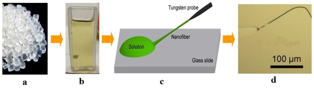 Polymer microfibers are usually fabricated by direct drawing of polymer solutions at room temperature. As shown in Figure 6, polymer bulk materials is firstly dissolved in a certain solvent to form a homogeneous polymer solution, and a droplet of polymer solution is picked up and placed upon a substrate (e.g., a glass slide) by a certain tip (e.g., tungsten probe); with the evaporation of the solvent, the viscosity of the solution gradually increases to an appropriate value for drawing; then, the tip is withdrawn with a speed of 0.1–1 m/s, and a polymer microfiber can be formed with excellent geometric uniformity.