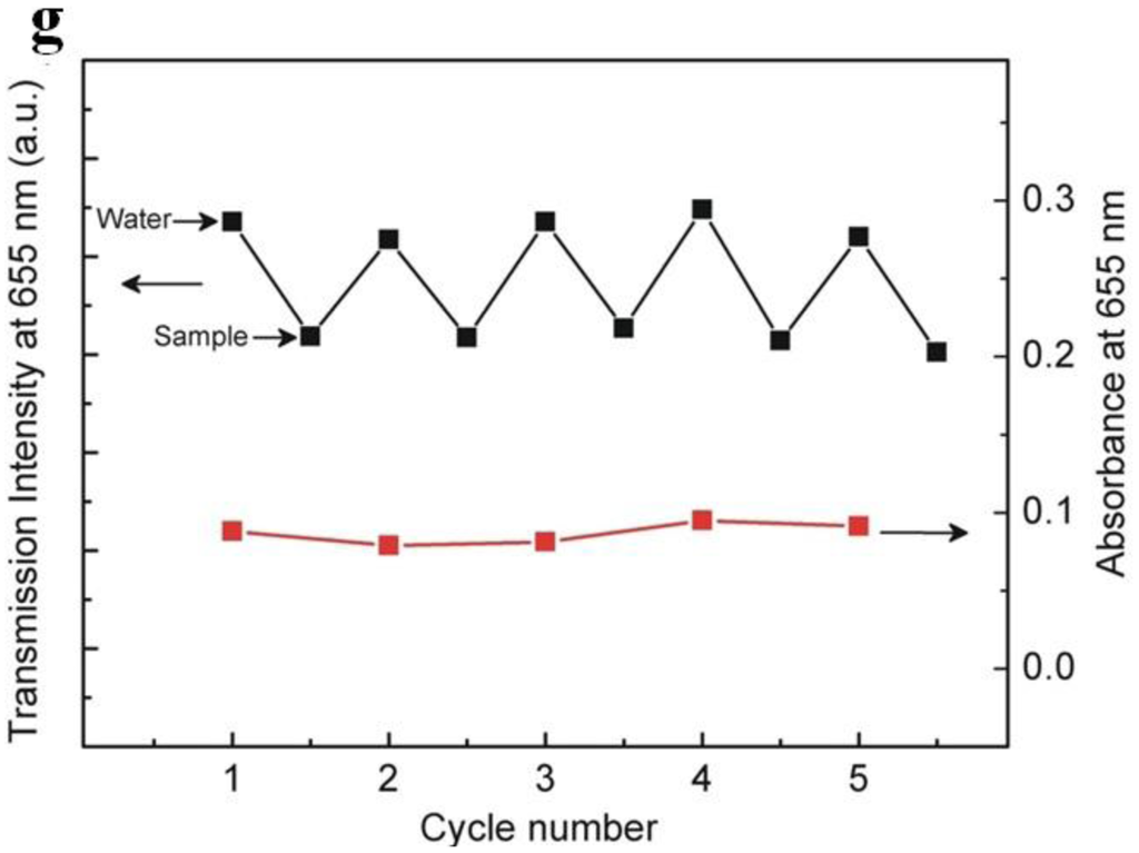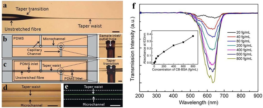 One of the most straightforward approaches to a microfiber optical sensor is using a biconical microfiber or fiber taper, which has been successfully applied in measuring a variety of samples. Due to its simple configuration, this kind of sensor usually measures the intensity transmission of the microfiber, and retrieve the sample information by concentration-dependent optical intensity. In 2007, relying on absorption of molecules adsorbed on the surface of a 500 nm diameter microfiber, Warken et al. reported an ultra-sensitive molecular sensor that was possible to detect sub-monolayers of 3,4,9,10-perylenetetracarboxylic dianhydride (PTCDA) molecules at ambient conditions [17]. Compared to microfiber sensors for air or gas that usually has a refractive index close to unit, the microfiber used for liquid (that has an index much higher than the air) sensing usually has a larger diameter. In 2005, Polynkin et al. reported a microfiber optical sensor for measuring the refractive index of liquids in microfluidic channels [32]. By measuring the refractive-index-dependent leakage loss of 1.5 μm wavelength light guided in a 700 nm diameter silica microfiber, they realized an accuracy of refractive-index measurement of 5.3 × 10−4. In 2011, by integrating a 900 nm diameter microfiber into a 125 μm wide microfluidic channel, Zhang et al. demonstrated a microfiber sensor for chemical and biological applications (Figure 8) [33]. As shown in Figure 8f, using a broadband white light as probing light with power of about 150 nW, the absorbance of bovine serum albumin (BSA) was clearly observed with a detection limit down to 10 fg·mL−1. In addition, Figure 8f provides transmission intensity of the microfiber response to analytes cycled with 500 pM methylene blue (MB) solution and ultrapure water, showing good absorbance reversibility of the sensor.