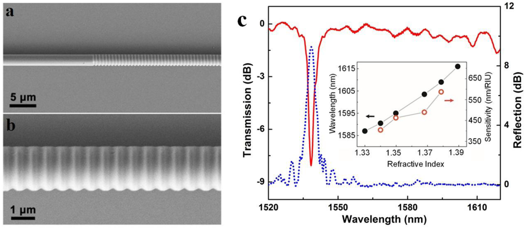 In principle, a microfiber Bragg gratings (MFBG) is a miniaturized copy of a standard fiber Bragg gratings (FBG), which spectrally manipulate waveguided light by periodically modified refractive index along the length of the fiber. However, due to its much smaller diameter and much more compact overall size, to obtain an evident grating effect, the index-contrast of the microfiber grating is usually much higher. In 2005, Liang et al. fabricated an MFBG by chemically etching a 6 μm diameter silica microfiber, which was successfully used for optical index sensing in liquids [39]. In 2010, Fang et al. reported MFBGs fabricated by femtosecond laser pulse irradiation. Using a 2 μm diameter silica microfiber gratings, they reported a maximum sensitivity of 231.4 nm/RIU at a refractive index (RI) value of 1.44 for RI measurements [38]. Around the same time, Zhang et al. reported a MFBG written in a photosensitive microfiber using KrF excimer laser, and demonstrated a sensitivity of 102 nm/RIU (at a RI value of 1.378) in a 6 μm diameter microfiber [36]. Shortly after, using focused ion beam to milling the sidewall of a microfiber, Liu et al. demonstrated a 518 μm length 1.8 μm diameter MFBG and a sensitivity of 660 nm/RIU for RI measurement around 1550 nm wavelength (Figure 9) [42]. Around the same time, Kou et al. reported a MFBG fabricated by FIB milling, and demonstrated temperature sensing from room temperature to around 500 °C with a sensitivity of nearly 20 pm/°C near the resonant wavelength of 1550 nm [41]. In addition, with similar other parameters, MFBG with thinner fiber and higher order mode can result in higher RI sensitivity [37].