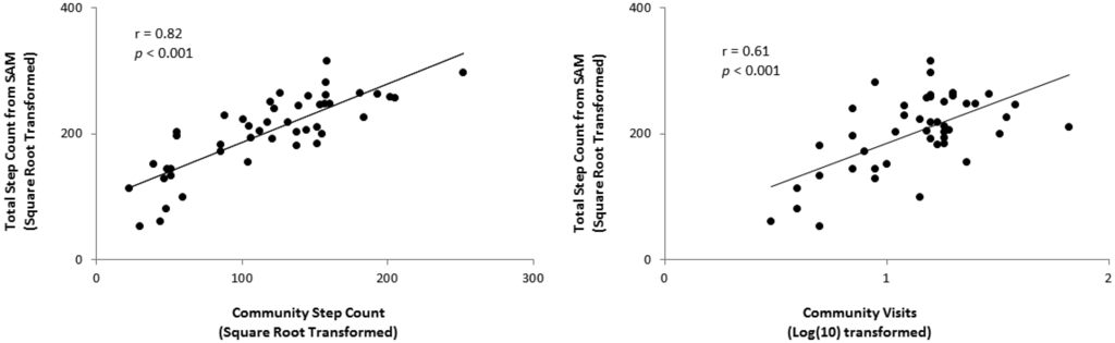 There was a significant positive correlation between our defined measure of community activity (community based step counts) and total step counts obtained from the SAM alone (r = 0.82, p < 0.001). There was also a significant positive correlation between our defined measure of community participation (number of community visits) and total step counts obtained from the SAM alone (r = 0.61, p < 0.001) (see Figure 2).