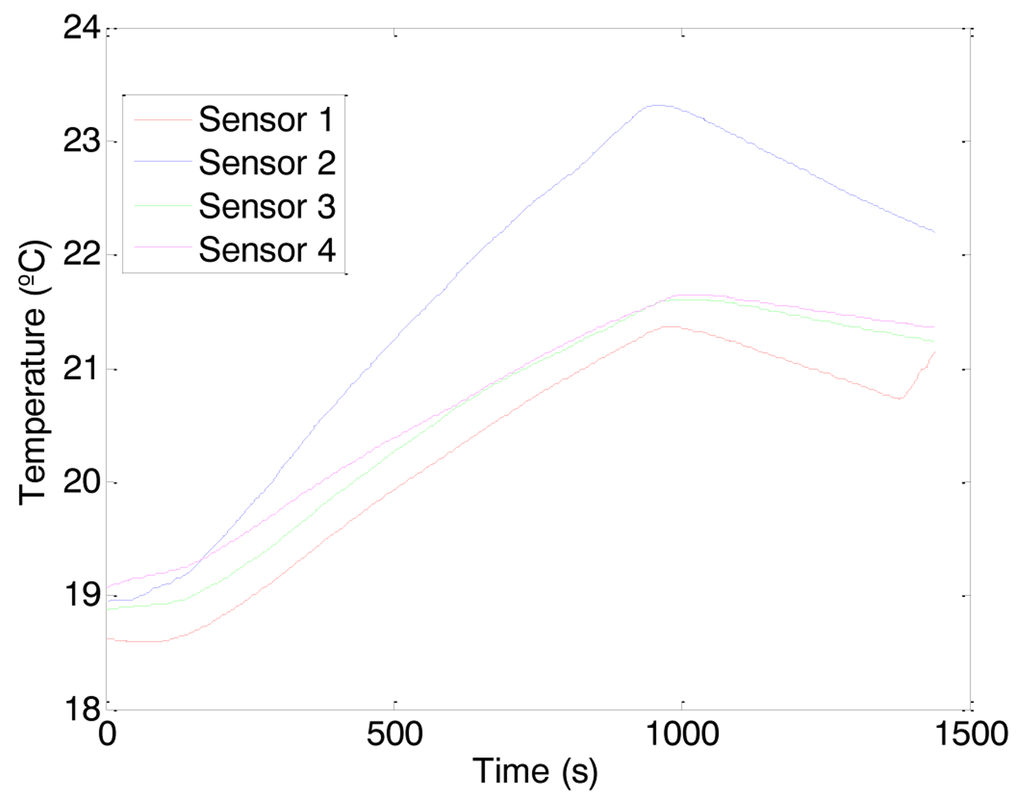 Figure 9 shows a representative dynamic temperature profile obtained with the four sensors used. This measurement confirms that the heating effect of the HVAC was focused just in the entrance of the office (Figure 9—Sensor 4). Additionally, the temperature over the table (Figure 9—Sensor 3) was slightly lower than in the occupancy area (Figure 9—Sensor 2) meaning that the propelled hot air arrives to the main occupancy area. This measurement results also reveals that the temperature profile measured in the location of the thermostat (Figure 9—Sensor 1) does not represent the temperature of the occupancy area although it was proportional to the other different temperature profiles obtained in the office.