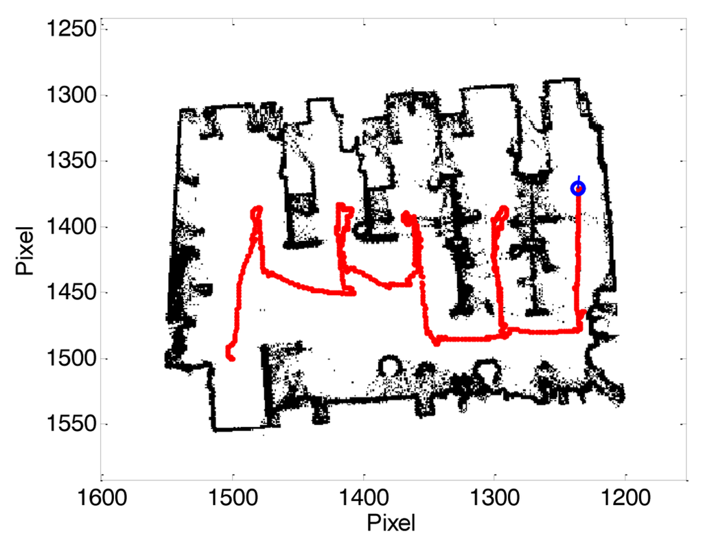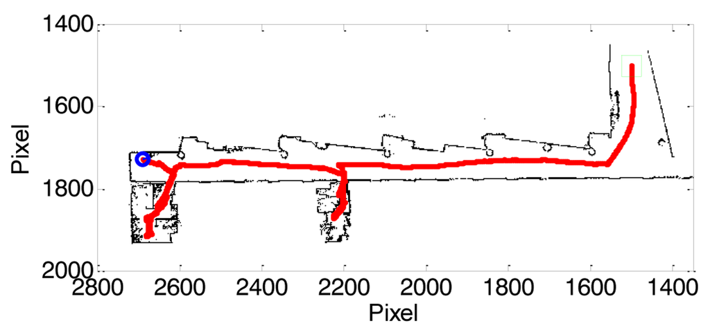 The exploration scenario tested in this paper is the second floor of the Polytechnic School of the University of Lleida. This area contains a large central corridor (42 m large and 2.5 m wide) with four laboratories (72 m2) in one side and 18 conventional small offices (9 m2) in the other side of the corridor. Both, the offices and the laboratories usually have the doors closed when not in use and opened when in use. At this moment, the mobile robot is not able to open a door so the exploration will be limited to the offices and laboratories with the door already open. Therefore, the exploration scenario may change between consecutive explorations. As an example, Figure 2 shows the raw binary map obtained with the SLAM procedure when exploring one of the available laboratories (one pixel of the image is equivalent to 30 mm). In this case, the exploration has started close to the reception desk and ended (blue circle) when the path planning algorithm has detected that all the surface of the laboratory was explored. The noisy points appearing in the raw binary map (Figure 2) can be reduced by performing additional morphological filtering but, in the practice, these noisy pixels have no effect in the SLAM procedure so the computational cost of applying a morphological filtering step after map update can be avoided.