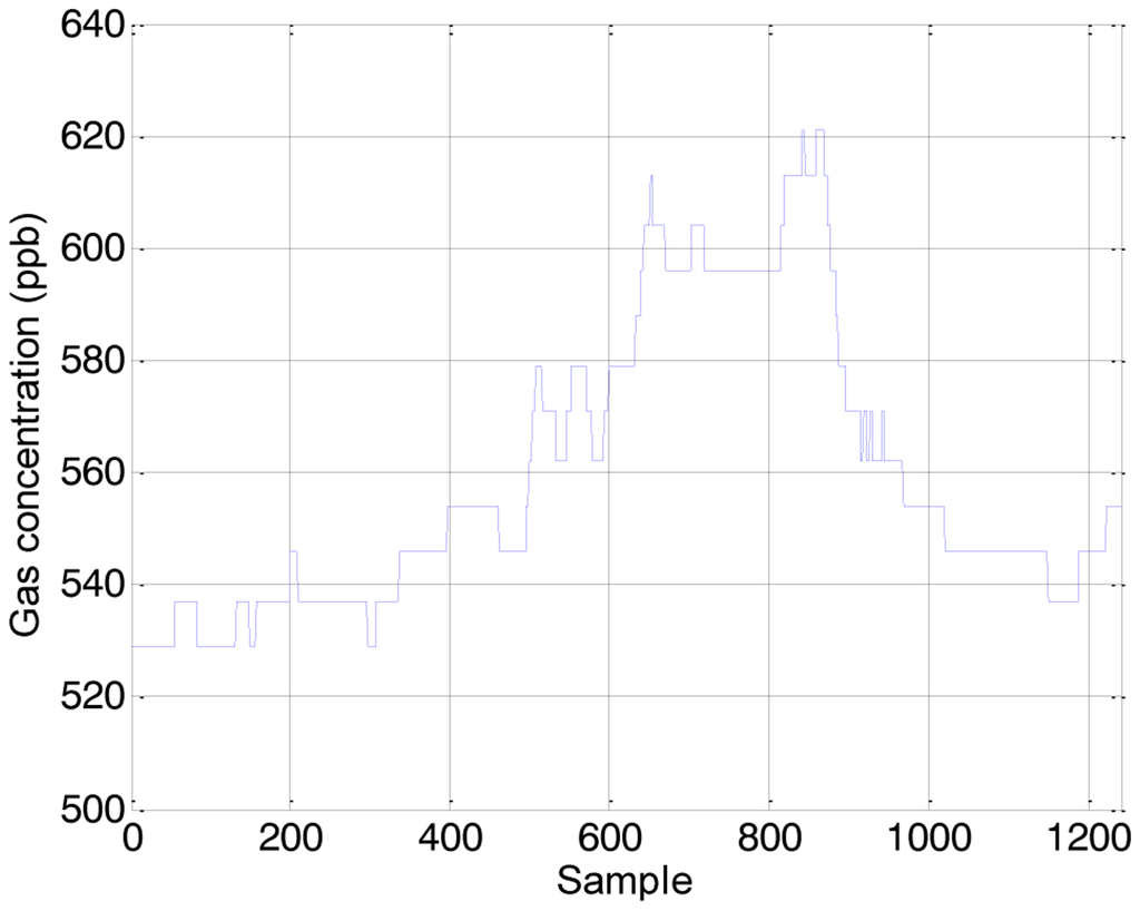 Figures 4, 5 and 6 show the raw data obtained by the sensors embedded in the assistant mobile robot. All the sensors are accessed with the same sampling time. Figure 4 shows the gas concentration measured with the PID sensor configured to detect acetone. The concentrations measured are always below the defined critical security thresholds but the concentration measured has unexpectedly increased inside the first office available and explored. After analyzing this profile, the cause can be the air recirculation system of the building that connects in some way the laboratories and the offices of the same plant. This unexpected connection between the offices and the laboratories can justify the definition of an ambient intelligence application with gas detection capabilities. Figure 5 shows the wind speed measured with the anemometer. The values measured show a constant profile during the complete exploration with peak values lower than 0.6 m/s which is considered as normal.