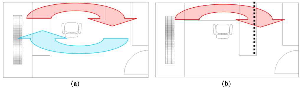 The temperature profile obtained during the exploration of the facility has originated an ambient actuation in a specific office of the building. First of all, the efforts have been focused on detecting the cause of the unexpected temperature profile measured. The physical differences with other offices have been carefully analyzed in order to establish some plausible cause hypothesis. Figure 7a shows the furniture distribution planned for the offices; this distribution contributes to the proper circulation of the hot air in the room that is propelled to the ceiling by an axial located below the window as a part of the HVAC. Figure 7b shows a schema of the real furniture distribution in the analyzed office; in this distribution, the table is an obstacle that may block the circulation of the hot air in the room.