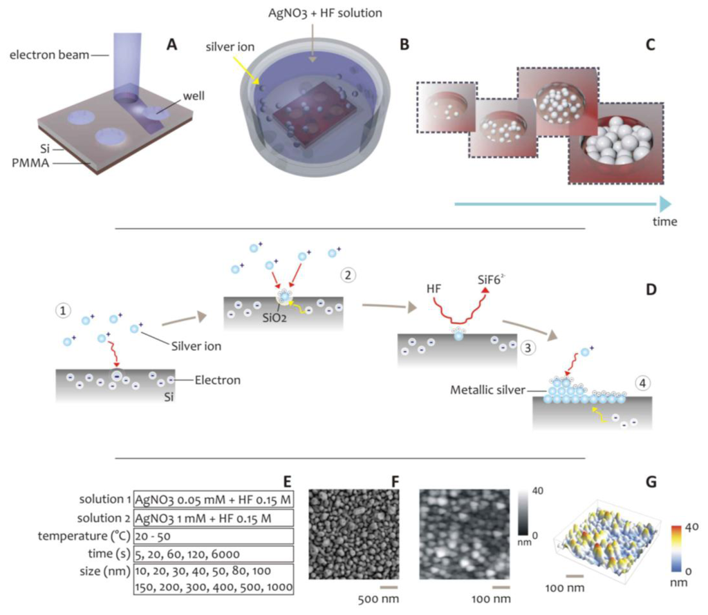The scheme of the electroless chemical reaction is briefly summarized in Figure 1D. This is a particular case in which the reducing agent is the substrate itself, silicon, that through its dangling bonding, oxidizes and reduces silver ions to the metallic forms, as described by the following chemical reaction: [23,39–41]: