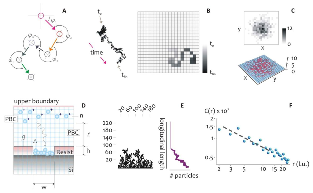 The mechanism of metal growth was here reproduced under the assumption of a DLA process, where randomly displaced particles stick together to form the intended structures. This assumption holds is true when diffusion dominates over chemical reaction or, equivalently, when the kinetics of metal reduction is extremely fast (tD ≫ tK), where tD and tK are the characteristic time scales of diffusion and chemical reaction. The model allows the understanding, at an atomic level, of the rules governing the evolution of the growth front, and to explore ways to tailor the morphology of the aggregates and their general characteristics [48,49]. In the model, the displacement of a metal ion, at any time, is arbitrary (Figure 2A), and thus the trajectory of the particles can be correctly described by a random walk, as in a Brownian motion.