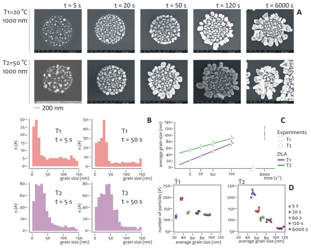 At each time step, SEM micrographs (Figure 3A) reveal the characteristics of the nano-grains assemblies and the differences between these for the (T1) and (T2) process temperatures. It can be observed that nano-grains are randomly distributed over the lithographed silicon surface, with a size that increases with time and that, on average, is smaller at T1 compared to the T2 temperature. Standard image analysis algorithms (Supplementary Section S5, in Figure S5a we show a representative SEM image of a cluster of nanoparticles, in Figure S5b, we show the size distribution derived from that image) were therefore utilized to gain quantitative details from the SEM images.