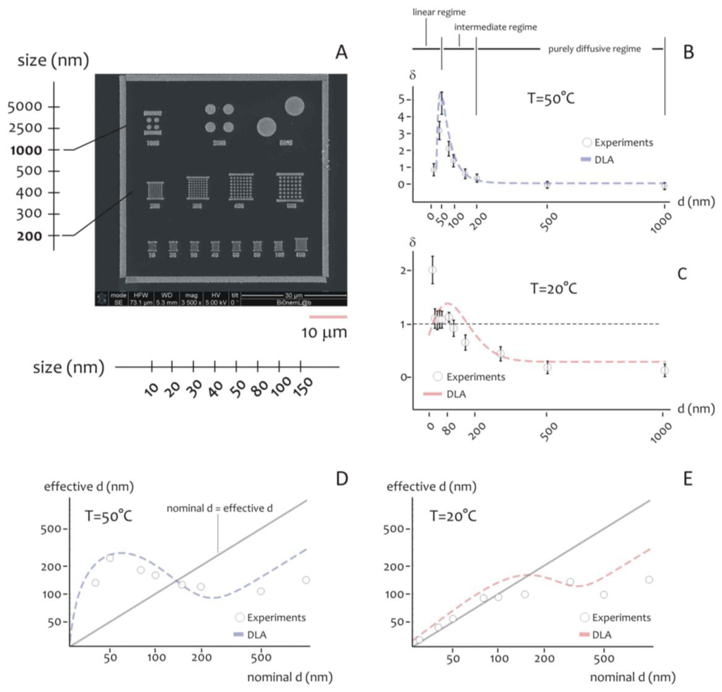 As indicated above, the shape of the distribution of cluster size varies depending on the ratio between the average cluster size and the diameter of the lithographed pattern. This suggests that the size of the active area of deposition would rule the formation of the aggregates, especially at the nanoscale. Further experiments were therefore performed to verify this hypothesis. Circular patterns were produced with a diameter ranging from few to some hundreds of nm (Figure 4A), silver nanoparticles were therefore deposited within those patterns for 20 s at lower (T1 = 20 °C) and higher (T2 = 50 °C) temperature. The resulting structures were therefore analyzed using direct SEM imaging and, from those images, the average cluster size was derived as a function of pattern diameter (in a separate Supplementary Section S6, in Figures S3 and S4, we report a selection of SEM images of the silver nano-particles aggregates at the smaller nano-metric scales). In Figure 4B the ratio of the cluster size S to the nominal pattern diameter δ = S/d is reported for d varying from 10 to 1,000 nm, in this case the temperature of the system is set at T = T2 (that is, higher temperature). Notice that δ gives a measure of the packing degree.