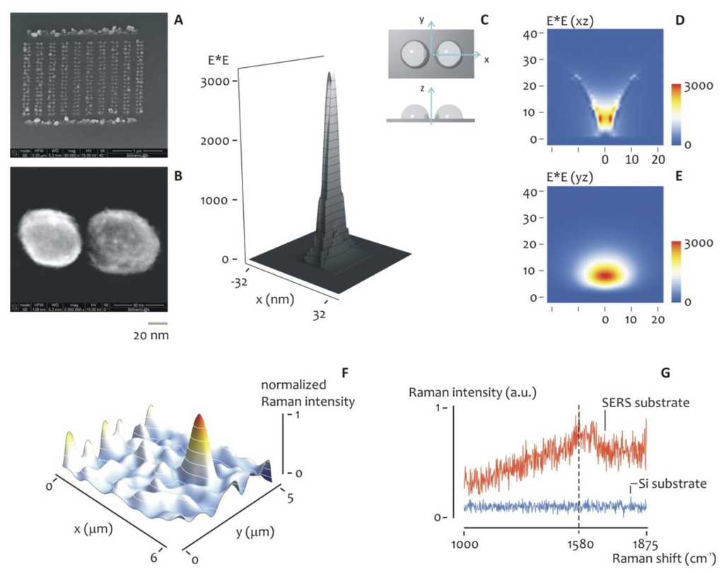 In Figure 5C, a 3D representation of the field intensity in the plane of the substrate is reproduced, while in Figure 5D,E the projection of such a field is reported in the xz and yz planes, where major details are shown, and where the electrical enhancement field reaches 103.