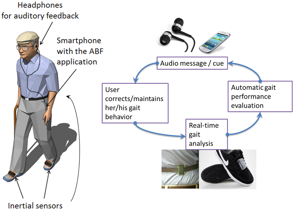The training scenario at the basis of this design includes unconstrained gait (with possible stops, turning, road-crossing, etc.) to be performed in combination with the biofeedback system. The long-term goal is to train people to maintain their own optimal gait for the entire duration of the trial (possibly lasting around 30 min). The system presented, and specifically developed, in this study is essentially composed of three elements: