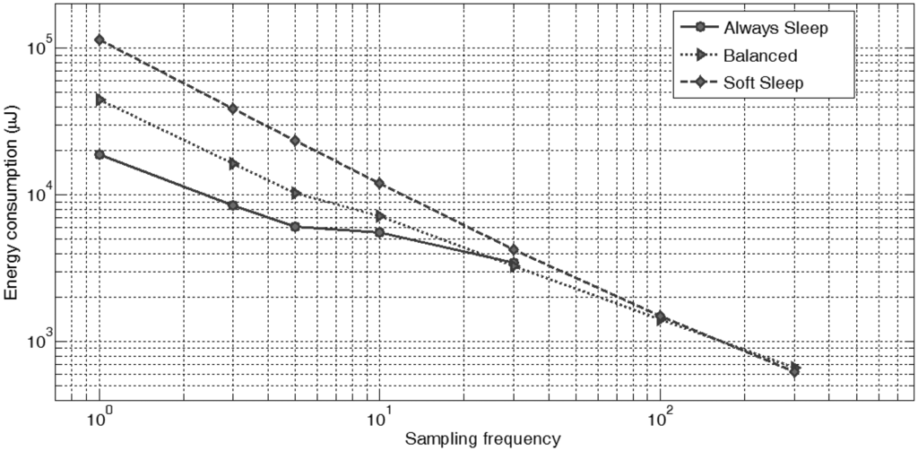 The use of an appropriate policy greatly reduces the energy cost: our results show that the reduction can be 7.5% when sampling at 300 Hz, 30% when sampling at 30 Hz and even up to 300% if sampling at 3 Hz, as shown in Figure 3 and demonstrated in detail in [24].
