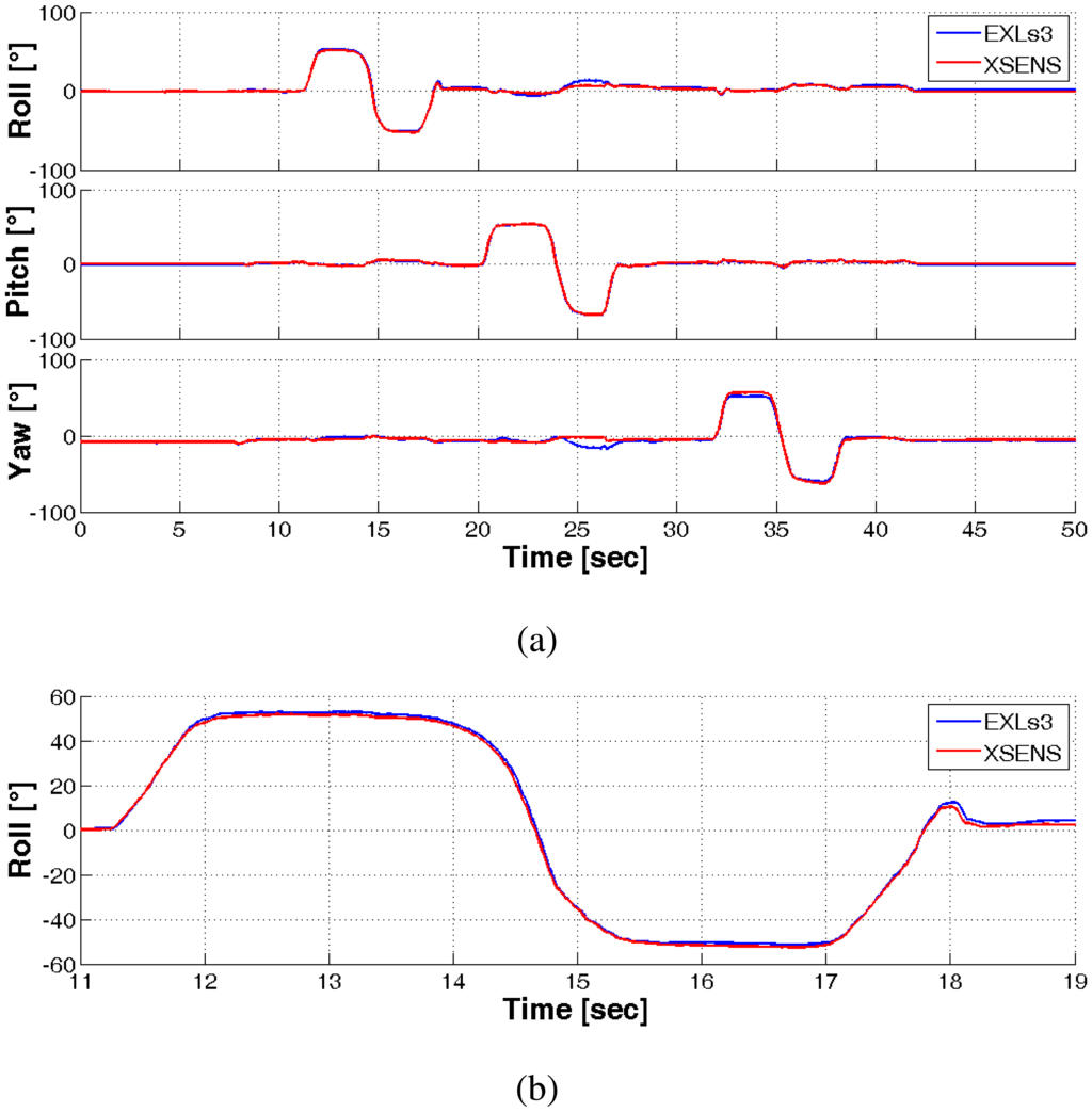 A further sensor validation check was performed in terms of orientation estimation, comparing the two sensing platforms. In this case, two nodes were attached to each other and rotated in air, while logging the computed orientation from the systems. The result of 50 s of computed data is shown in Figure 4. The difference between the two estimations is minimal, even if the two nodes were manually aligned, with an RMSE of 1.818, 0.594 and 2.941 degrees for the three estimated angles.