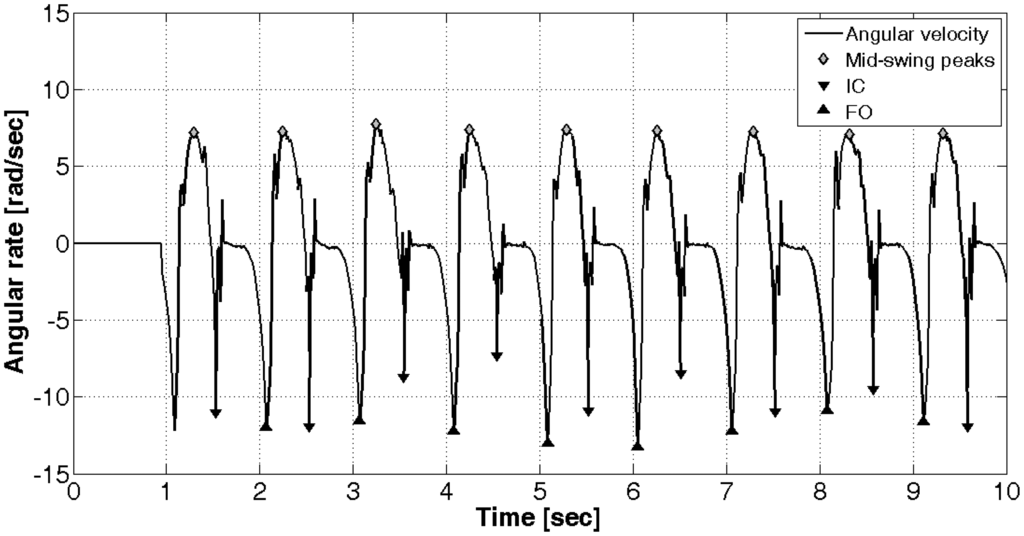 For the automatic detection of gait events using inertial sensors, several approaches have been proposed in [35,36]. They differ in terms of sensor locations and the processing of accelerations and/or angular velocities to estimate IC and FO events [35].