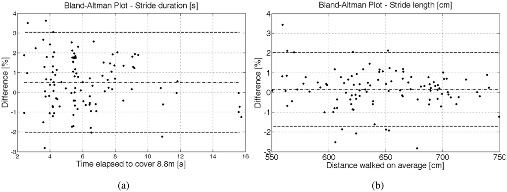 In order to test the step length, five male PD patients walked five times at comfortable, twice at increased and twice at decreased gait speed over an 8.80-meter instrumented GAITRite walkway (GR, CIR Systems Inc, PA) set at 100 Hz. The patients were aged 5,087 years with Hoehn and Yahr stages 13. Hoehn and Yahr is a clinical rating scale for disease severity in Parkinson, ranging from zero (no signs of the disease) to five (bedridden). The patients were tested on medication, taken in their usual dosage. The IMUs were set at 200 Hz and fastened on top of the participants’ shoes; the same two IMUs with the same Kalman filter settings were used for all patients. IMU data collection was performed via Bluetooth by means of the Android application. For each of the nine trials, the total duration and length of the strides was obtained both from IMUs and GR. Figure 6 shows, in Bland-Altman plots, the differences in the percentage between step duration and length estimated with IMUs and GR.