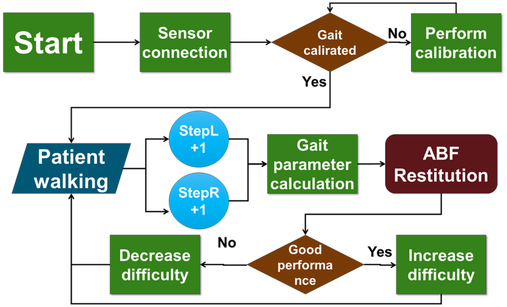Overall, the functional goal of the system entails the improvement of the gait’s rhythm and amplitude, the reduction of asymmetry and the correction of unstable posture assumption by means of recurrent audio feedback provided in real time during unconstrained walking. Feedback restitution is performed by a logic flow of states and conditions able to tutor the patient in maintaining the gait pattern and performance at a specific target set by a clinician. Furthermore, the frequency and total amount of messages provided to the patient are adaptively controlled, to avoid saturation effects. Besides, the degree of difficulty of the task is automatically tuned to be challenging, but not too demanding. Finally, vocal messages, encoded by a text-to-speech application, have been formulated from clinicians to stimulate those motor adjustments usually prompted during rehabilitation sessions in clinical environments.
