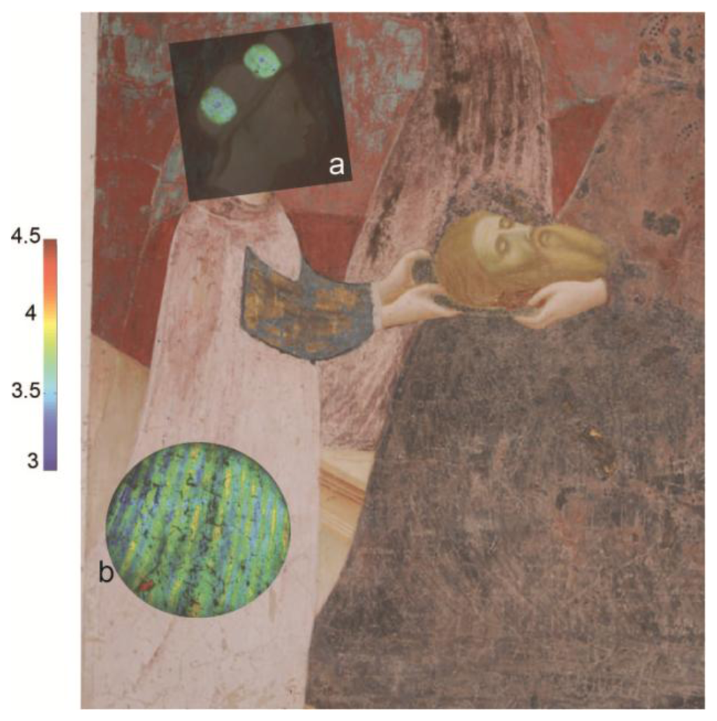 The presence of an organic lake pigment was successfully mapped using FLIM on a Renaissance wall painting by Masolino da Panicale (1383–1447). The analysis was part of a three year monitoring campaign on the paintings of the Baptistery of Castiglione Olona (Varese, Italy) and it was combined with other advanced imaging techniques and with laboratory analyses on an historical micro-sample from the painted surface [40]. The FLIM maps were obtained from various areas, but the most interesting information came from the figure of Salome, as reported in Figure 5.