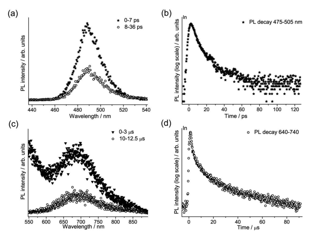 A group of sixteen commercially-available modern cadmium-based pigments, which are binary alloys of ZnS and CdS (Zn1-xCdxS with 0 < x < 1), and of CdS and CdSe (CdSxSe1-x with 0 < x < 1), were studied in the laboratory with the TRPL device opening new frontiers both for the characterization of the material itself and for the understanding of their degradation paths. Our attention focused on the photoluminescence emissions from the band edge (Eg) and the first deep trap state (Et1) [19,42], respectively related to the crystal lattice and to defects and vacancies present in it. The time-resolved analysis permitted a deeper study of this class of pigments compared to the spectrally resolved results obtained in previous studies [6,42]. The gated spectra and the emission decay kinetics from one of the yellow shades are presented in Figure 6.