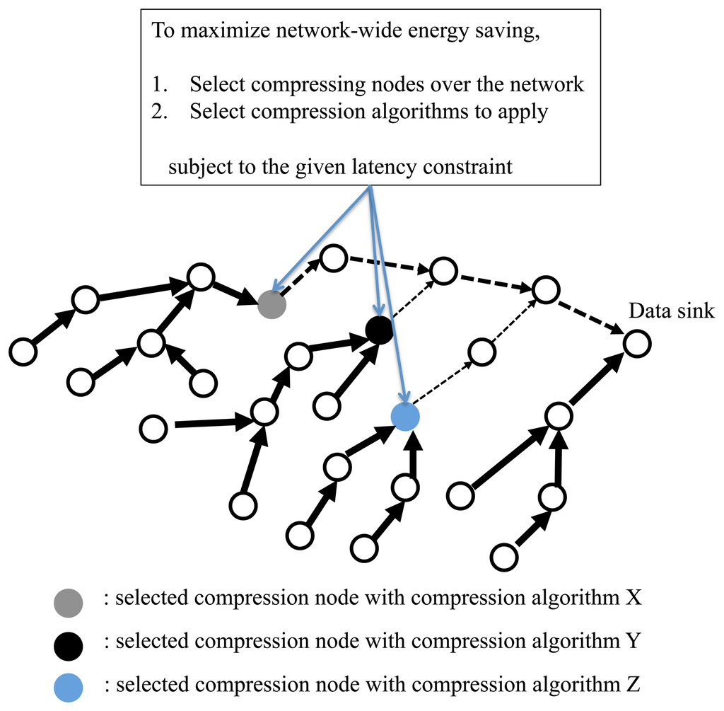 We assume that in a normal data collection mode (where no data compression is applied), a data sink receives routing path information from data sources. We also consider route variations resulting from link dynamics. The problem of energy-efficient data collection with data compression techniques can then be described as finding a network-wide optimal decision of which relay sensor nodes are allowed to compress data using which compression algorithm with respect to a given packet deadline requirement, as illustrated in Figure 1. After informing about the decision information of the network, the data collection protocol switches to the optimized data collection mode that uses selective data compression, leading to significant energy savings throughout the network.