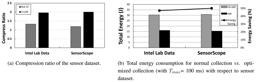 We use the sensor datasets of the Intel Lab data [19] and SensorScope [20] to measure the compression-based algorithm performance. We use a part of the data in the normal collection mode in a learning phase when the optimized compression node and type selection (among no-compression, S-LZW and RLE-ST) are calculated based on the training data. We apply the computed optimized selection to different parts of the dataset as test data and measure the performance. The Intel Lab data is used as the default, unless otherwise noted.