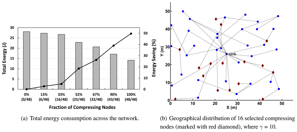 We investigate the effect of the fraction of compressing nodes to use in our advanced optimization algorithm in Section 5.2.1. As the penalizing factor, γ, for the number of compressing nodes varies from zero to 50, we measure the total energy consumption. As the network is allowed to use a larger number of compressing nodes, our technique significantly reduces the total energy consumption, as indicated in Figure 11a (see the geographical distribution of the selected compressing nodes in Figure 11b). This means that if the network uses only a few selected nodes that execute compression, the overall network can benefit from the even limited number of resources in terms of energy efficiency.