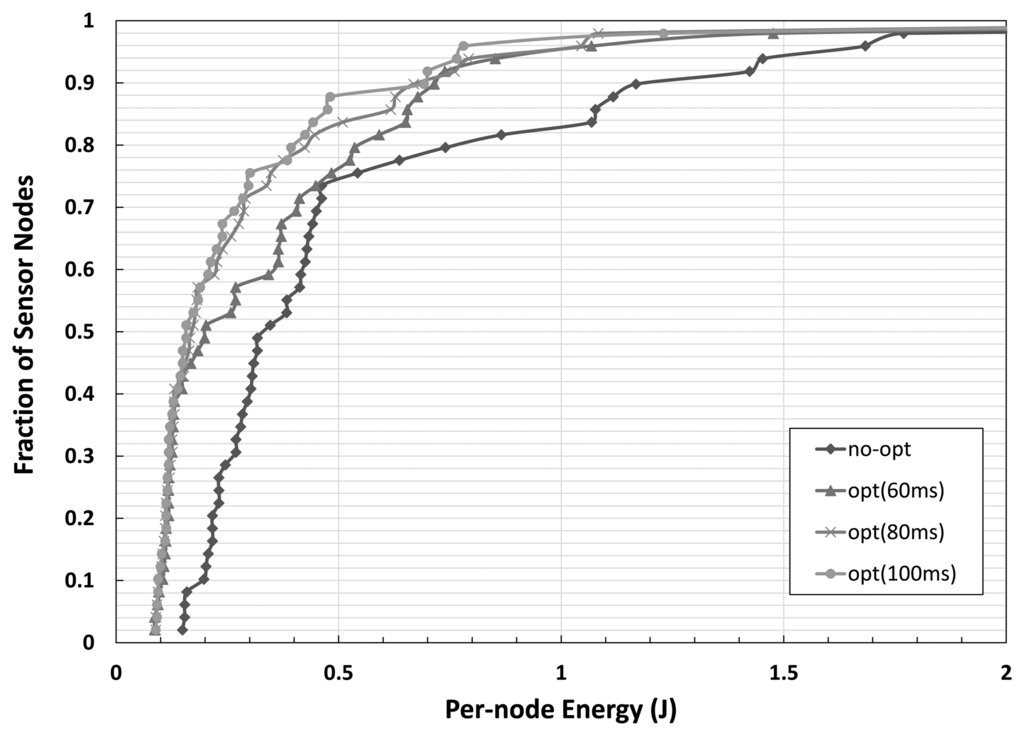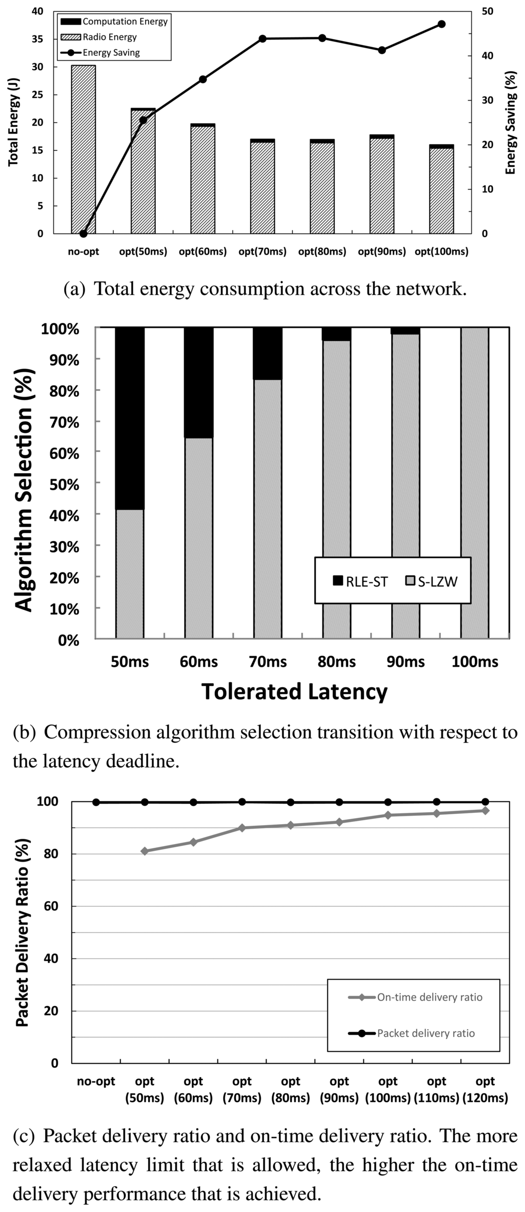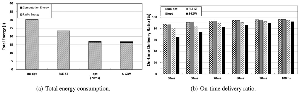 We investigate how our adaptive selection algorithm performs compared to each stand-alone compression algorithm in terms of total energy consumption and the on-time delivery ratio, as in Figure 12. We conduct several experiments, such that each data source node always compresses with only S-LZW or only RLE-ST, respectively. Figure 12a shows that our opt algorithm (where Tmax = 70 ms) significantly reduces total energy consumption, achieving almost the same total energy as only S-LZW. As Figure 12b shows, on the other hand, the on-time delivery ratio of only S-LZW drops down to around 83%, whereas the opt scheme achieves an on-time delivery of 90%, where Tmax = 70 ms. Furthermore, it should be noted that the upper bound of the on-time delivery is given by the on-time delivery ratio of no-opt under the given network setup. Particularly looking at the latency of 70 ms, our opt drops only 3% compared to the upper bound in contrast to over 10% in only S-LZW. Therefore, our opt scheme is a better choice than only S-LZW in the range of tolerated latency less than the total incurred time of the packet travel time over multi-hops and the compression processing delay.