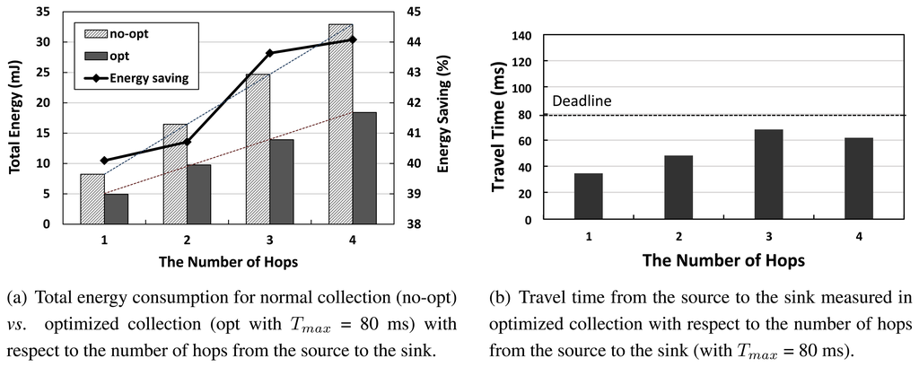 Next, we evaluate the network performance with respect to the number of hops from the source to the sink. This is to analyze how the network-wide energy savings gain is obtained with respect to hop distance from the source to the sink in Figure 8. As Figure 8a shows, the energy savings gain increases as the number of hops does. This is due to the following fact: without any constraint on the number of compressing nodes to use, each data source has been selected to compress its own data with a suitable algorithm, such that the given latency is considered to have been met. The amount of energy savings has been accumulated across a series of hop relays to the sink. Figure 8b shows that on-time packet delivery across a multi-hop path is achieved on average.
