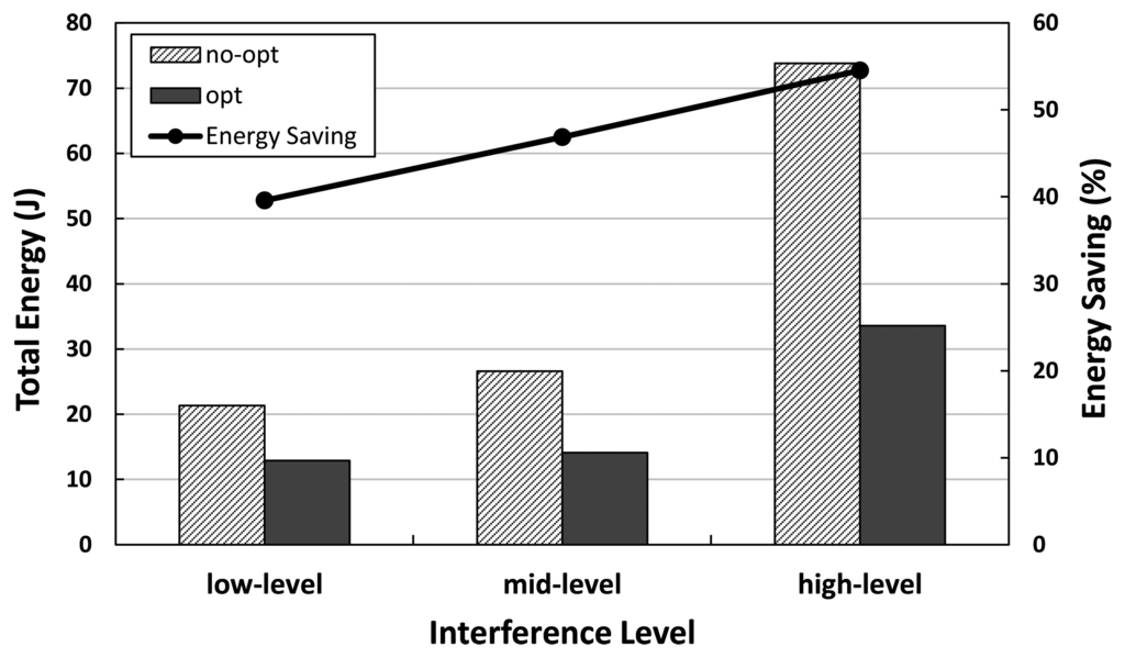 As Figure 9 shows, the energy savings effect becomes more prominent as the interference level increases. This means that under a high interference environment, where a large number of retransmissions occur, our optimization technique further reduces the total energy consumption and leads to more energy savings, up to 55%.