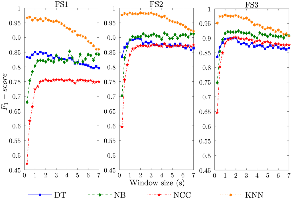 The classification paradigm determines the impact of the window size on the recognition performance. The NB and NCC models show an increasing performance as the size of the window grows. The minimum performance is obtained for 0.25 s, which nevertheless increases up to 30% when the window is enlarged to 1 s. Actually, a “cut-off” window size is found at 1 s for all feature sets. From that value on, no significant benefits are obtained in general. For NB-FS1, less than a 5% improvement is achieved for some random window sizes when compared to the performance at 1 s. This also applies to a lesser extent for the NB-FS2 model. Conversely, increasing the window size more than 2 s entails a worsening of the recognition performance for NCC-FS3. DT shows a top performance for window sizes between one and 2 s. Upper and lower values to these generally decrease the performance of the recognizer. The KNN model stands out among all evaluated techniques and allows us to maximally reduce the window size. This technique provides the highest performance, with an F1-score above 0.95 for the simplest realization (FS1) and close to one for FS2 and FS3, all for minimum window sizes (0.25 s–0.5 s). For window sizes higher than 2 s for FS1 and FS3, and 3 s for FS2, the performance of the KNN systems decreases monotonically. The lowest performance is achieved for a window size of 7 s, which, for some cases, is up to 15% less than the baseline.