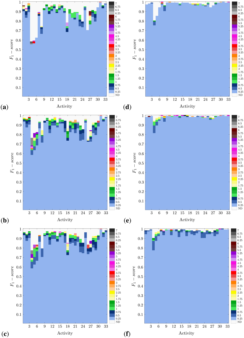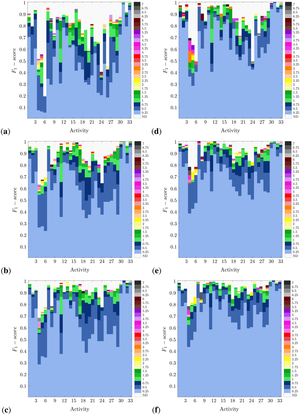 The recognition capabilities of a given system are normally measured in terms of accuracy. Despite this metric having been and being extensively used in many fields, its use is only recommended for those problems in which there are no imbalance issues [84]. Because of this, in this work, we rather used the F1-score metric, which lacks this sort of limitation. Consequently, the results obtained in this work could be generalized for each activity independently of the number of available instances for each target activity.