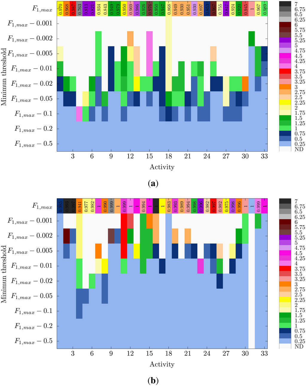 The F1-score [81], a combination of precision and recall measures, is used as a performance metric to assess the quality of the recognition for each system design. This metric is particularly interesting for its robustness to class imbalance, which happens to occur when there are more instances for some activities than for others. The F1-score ranges between [0,1], where one represents an optimal recognition capabilities, whilst zero corresponds to a system that is not capable of recognition at all.