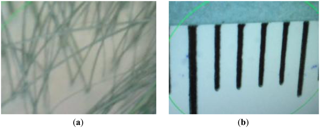 Devices equipped with cameras with high-magnification zoom lenses have been widely used to diagnose the treatment region on a patient’s scalp [1–3]. Since a detailed view of the skin is needed, a high-magnification zoom lens is required to photograph it. Consequently, the field of view (FOV) of the camera is very small, as shown in Figure 1, where the vertical (black) lines show the gradations (markings) on a ruler. The green lines of Figure 1 are indication lines formed by the commercial device used in order to highlight the region of interest in diagnosing a patient’s skin.