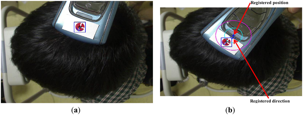 Figure 10a shows the results of the detection of the center and the direction of the marker. When the system is in treatment mode, the registered center (cross-mark in Figure 10b) and the direction (arrow in Figure 10b) of the marker are displayed, as shown in Figure 10b, and the user attempts to fit the center and the direction of the marker into the ones displayed. By displaying two additional circles (the light-blue and violet circles in Figure 10b) based on the accurately registered center position and the direction of the marker, our system helps the user quickly move the device to the correct position. The violet circle shows the rough region of the registered position of the center of the marker, while the blue one represents a more accurate region of the same. By displaying these two circles, the user (doctor) can easily fit the position of the center of the marker on the device to the accurately registered position (the dark blue cross-mark within the blue circle of Figure 10b).