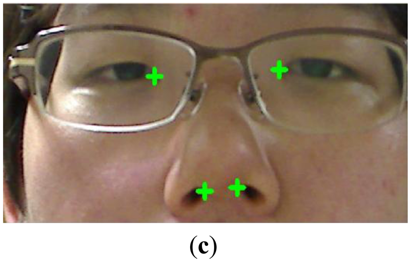 During automatic detection of the position of the facial feature in registration mode, we use sub-block difference-based matching to detect the outer corners of the eyes. We use binarization to detect both nostrils and to obtain the geometric center of each nostril. The position of the eyeballs changes according to the direction of the patient’s gaze, and can cause a variation in the position of the patient’s head if used as a reference point (adjusting the user’s head on the fixing bar of our device based on the positions of the eye balls). Thus, we use the corners of the eyes to adjust the position of the patient’s head in our system, as shown in Figure 10c.