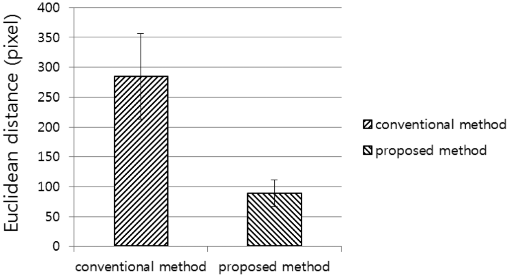 In the third experiment, we compared the detection error of the proposed method with that of the conventional method. Here, the conventional method means that the testers first recorded the position of the diagnostic device on the subject’s head on a medical chart, and then attempted to find the position by referring to the chart. The detection error is calculated in terms of the Euclidean distance between the registered center position of the marker and the detected position. The experimental results showed that the detection error of our proposed method was smaller than that of the conventional method (Figure 12). A two-tailed t-test was performed based on the standard deviations and the means of each group [19] to analyze the statistical significance between the two datasets. The calculated p-value of 4.04 × 10−21 clearly shows that the detection error of the proposed method is significantly smaller than that of the conventional method, with a confidence level of 99% (0.01) [19]. We used as null-hypothesis the claim that there is no difference between the detection error of the proposed method and that of the conventional method in Figure 12. According to the principle of the t-test [19], if the p-value is less than the confidence level, the null-hypothesis is rejected, which represents that there exists a difference between the detection error of the proposed method and that of the conventional method.