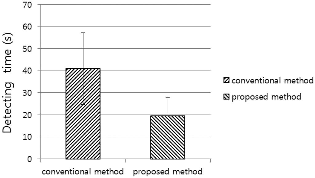 In the next experiment, we compared the detection time of the proposed method with that of the conventional method. The detection time is the time taken by a tester to successfully locate the registered center position of the marker. The experimental results showed that the detection time of the proposed method was less than that of the conventional method (Figure 13). A p-value of 5.39 × 10−10 proves that the detection time of the proposed method is significantly less than that of the conventional method, with a confidence level of 99% (0.01) [19]. We used as null-hypothesis that claim that there is no difference between the detection time of the proposed method and that of the conventional method in Figure 13.