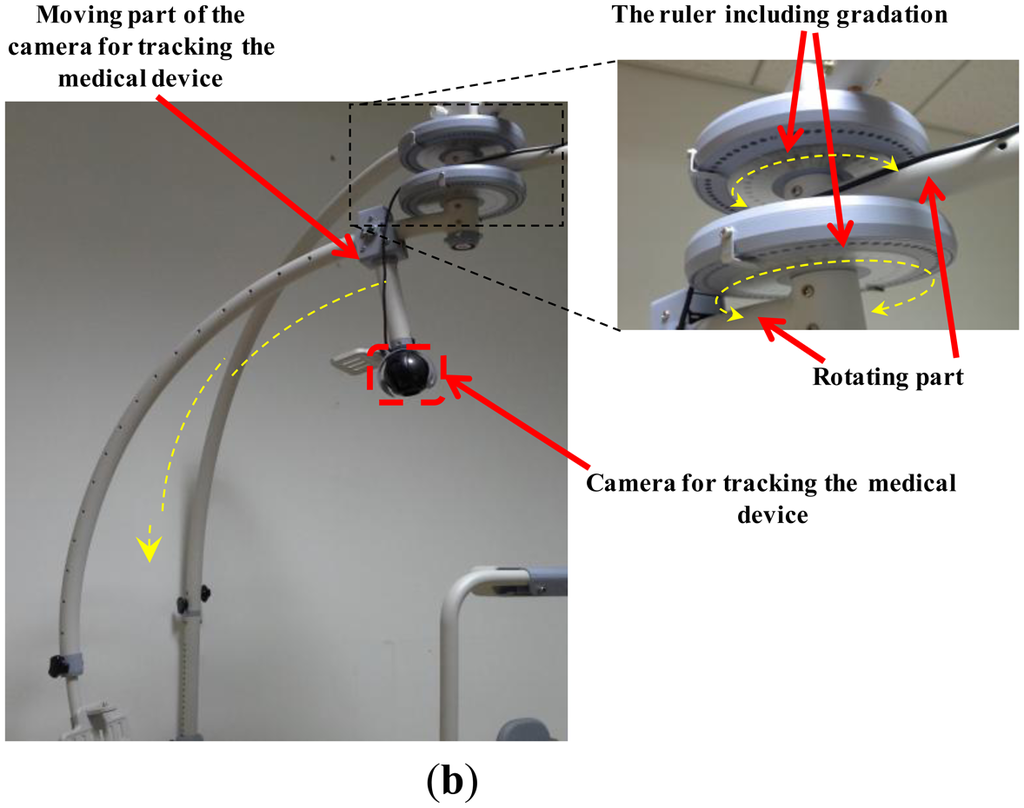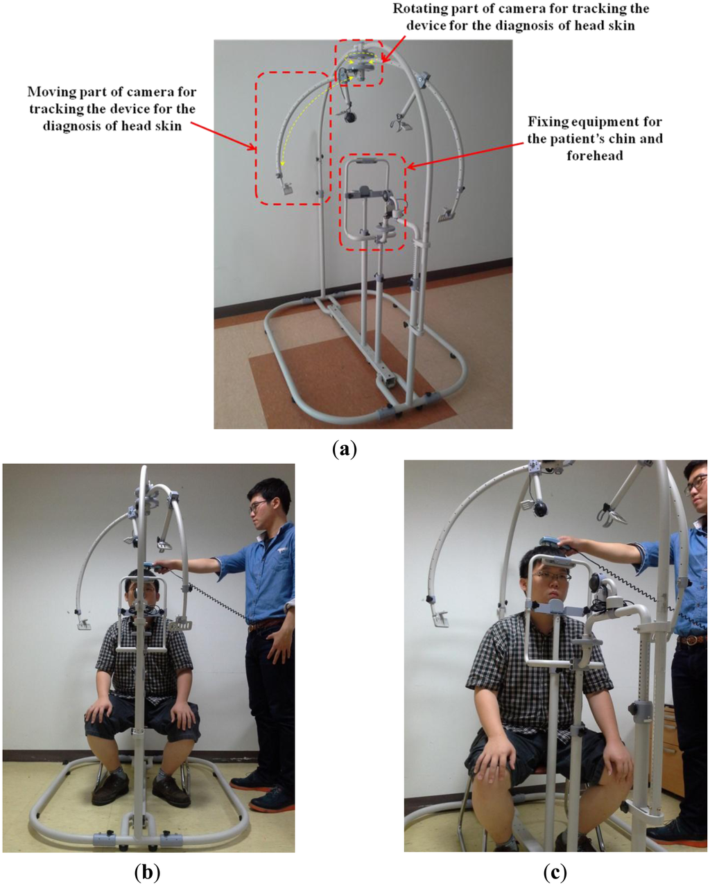 Figure 2a shows our proposed system for tracking medical devices used in diagnosing scalp skin. The system includes equipment to immobilize the patient’s chin and forehead and the parts to move and rotate the camera to track the medical device. As shown in Figure 2b,c, a patient places his/her chin and forehead on the fixation equipment and the user rotates/moves the camera to capture the image of the medical device (see details in Section 2.2). The overall procedure is shown in Figure 3.