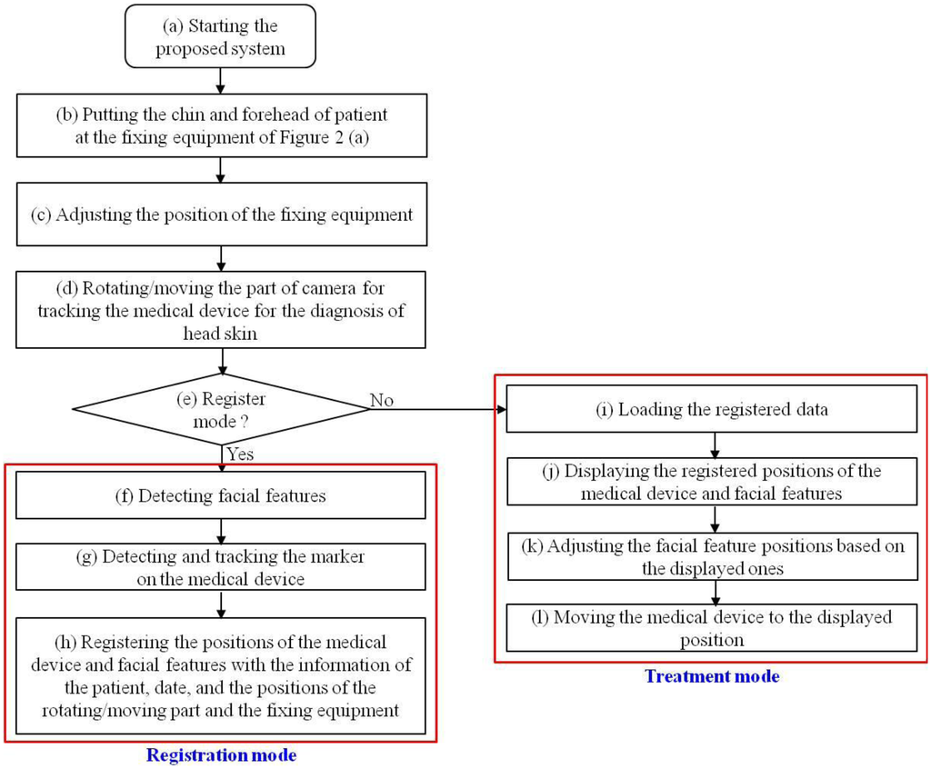 We propose a new, convenient, and cost-effective system for tracking devices used to diagnose the skin on a patient’s scalp. The proposed system comprises two inexpensive web cameras to capture images of the face and a diagnostic device, along with equipment to immobilize the patient’s chin and forehead. A user can easily position the camera to capture images through the diagnostic device by manually moving a frame to which the camera is attached. The position of the equipment used to immobilize the patient’s chin and forehead can also be manually adjusted to the patient’s height and the shape of his/her face. The system detects facial features, such as the nostrils and the corners of the eyes, to accurately align the patient’s head according to its previously recorded position. The position of the diagnostic device is successively tracked through captured images by detecting the position of a color marker attached to the device. Table 1 summarizes the comparison between our proposed method and previous methods for tracking medical devices.