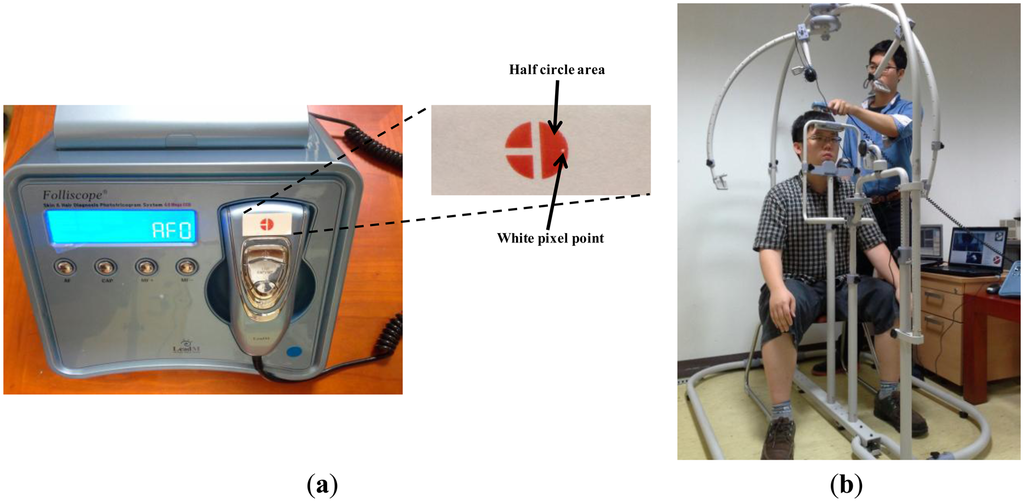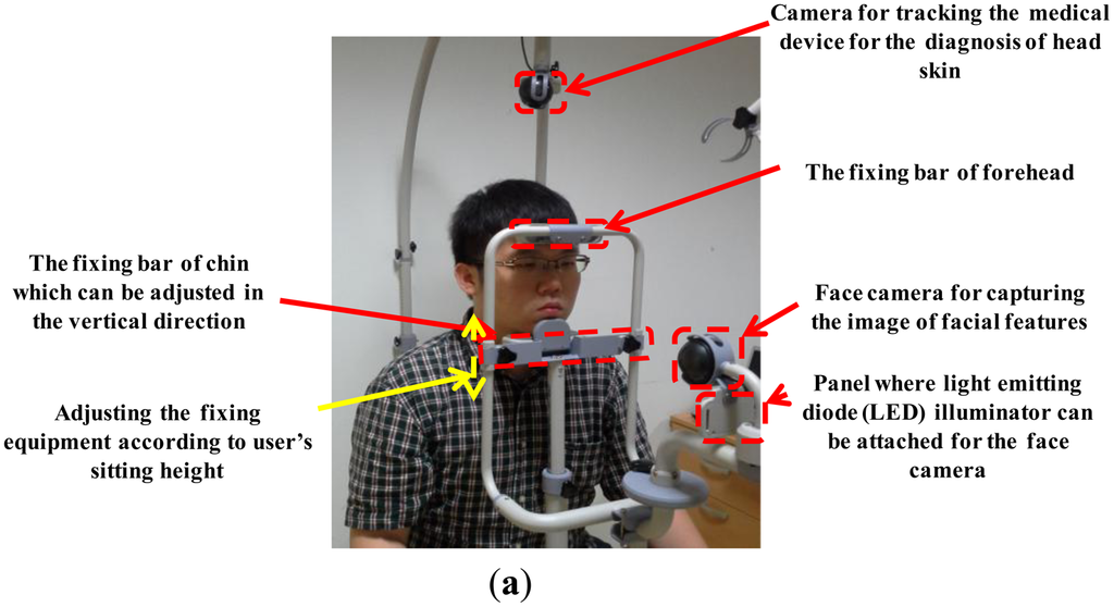 The system can be disassembled, which makes it easy to move. As shown in Figure 4a, the patient places his/her chin and forehead on the fixation bars. The fixation bar for the chin can be vertically adjusted to accommodate different facial sizes. Moreover, by vertically adjusting both the chin and the forehead fixation bars, the system is able to accommodate different sitting heights. As Figure 4a shows, the web camera captures 24-bit color images (1,600 × 1,200 pixels) of the face and facial features are detected in the image (see Section 2.3). To obtain the image of the face even in low illumination, additional light-emitting diode (LED) illuminators can be attached below the camera that captures the patient’s facial features. Even though the user places his/her chin and forehead on the fixing bar, the position of the head can vary because it is not tied to the fixing bar and because the chin and forehead shapes vary from person to person. Thus, an additional camera for tracking facial features is required in our system. By adjusting the position of the patient’s head based on his/her facial features, the position of the optical device used in diagnosing scalp skin can be detected more accurately.